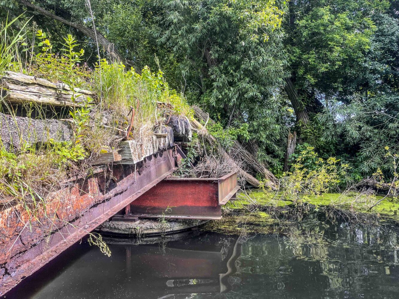 Pearson Engineering was engaged by the City of Orillia in 2024 to complete the detailed design and tender document preparation for the permanent removal of the old bridge structure at their Waste Diversion Site. The construction scope of work included the full removal of the bridge superstructure and partial removal of the abutment and pier supports. The roadway approaches and watercourse embankments were regraded and restored utilizing rip-rap protection and hydroseeding. Removal of the bridge superstructure was completed utilizing barge access to avoid impacts to the natural watercourse below.